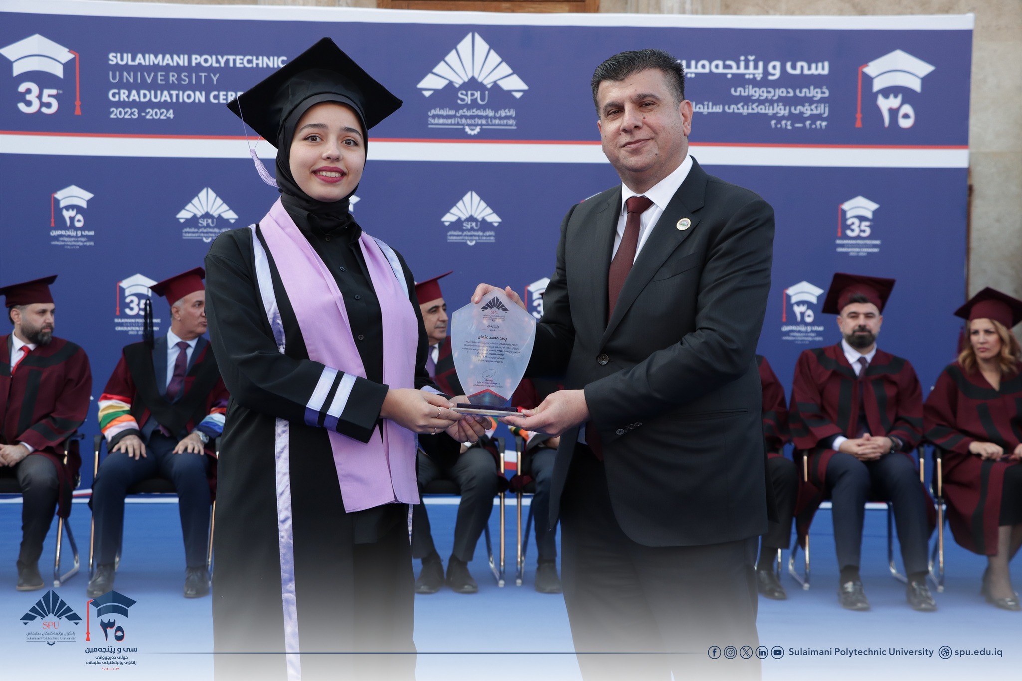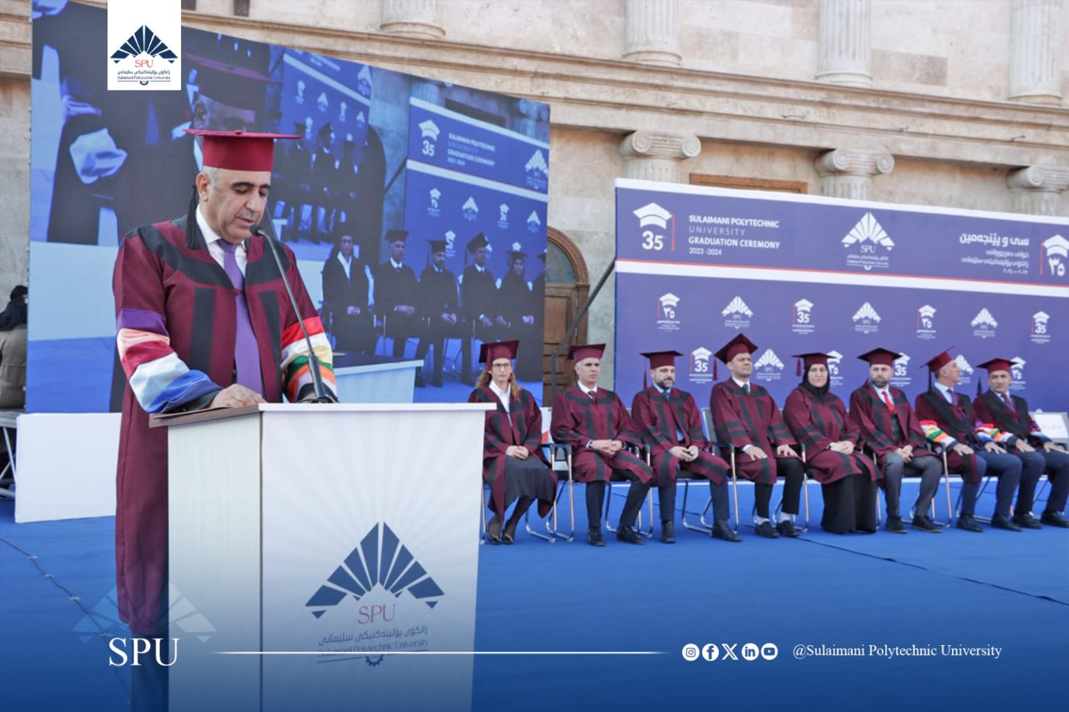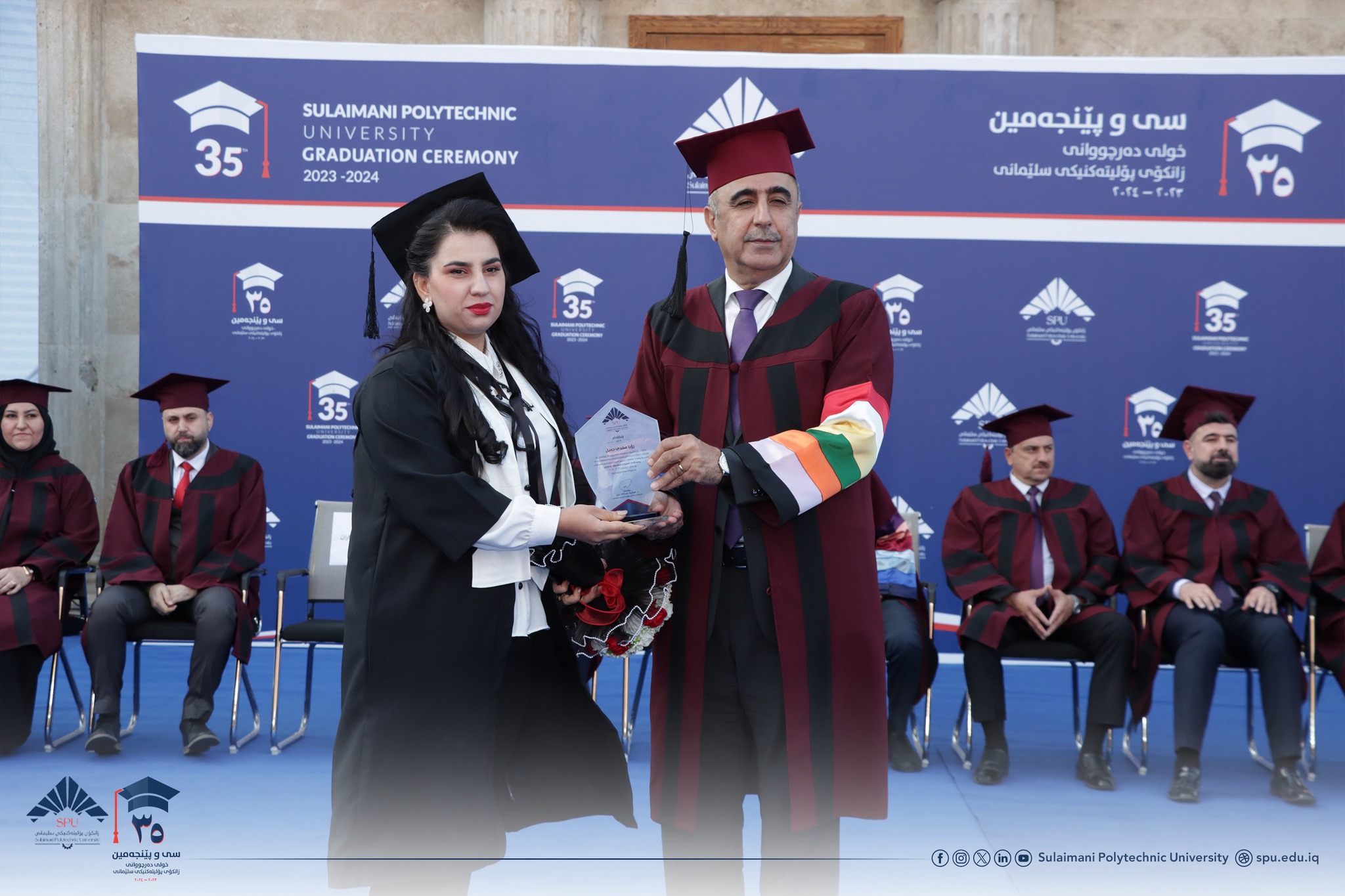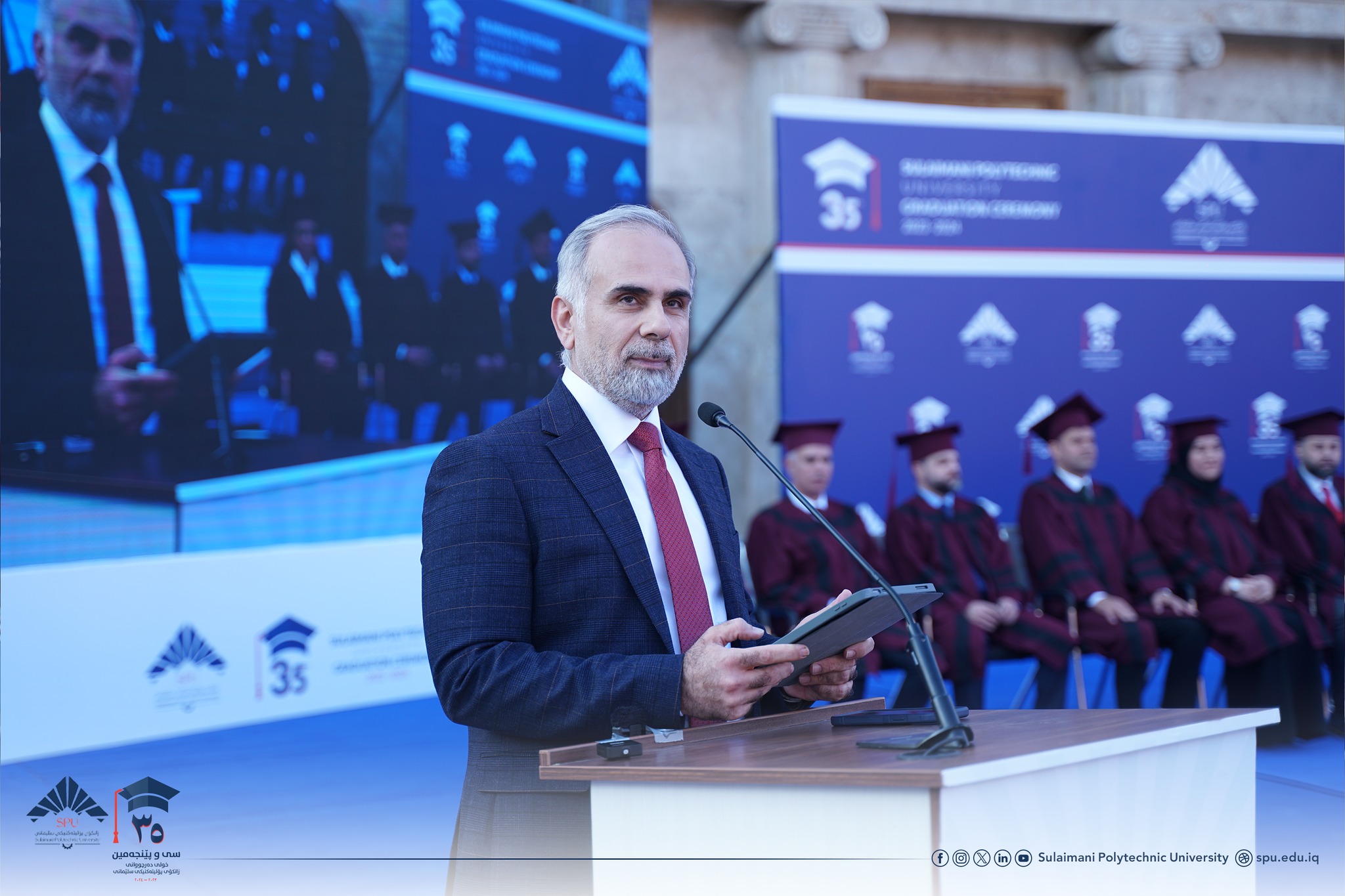 Prof. Dr. Hoshyar Abdullah Aziz, President of Sulaimani Polytechnic University, delivered a speech. After welcoming the guests, he congratulated all the students and wished them a bright future. In his speech, he hoped that in the future they will play a significant role in the development of Kurdistan. He reaffirmed the support of the university to the students and said that the level of science is very advanced. He also said that as one of the most prominent scientific and technological centers in the Kurdistan Region, Sulaimani Polytechnic University has always tried to become a bridge between science and industry, between theory and practice, so you, as graduates of this university, are now part of this proud heritage.