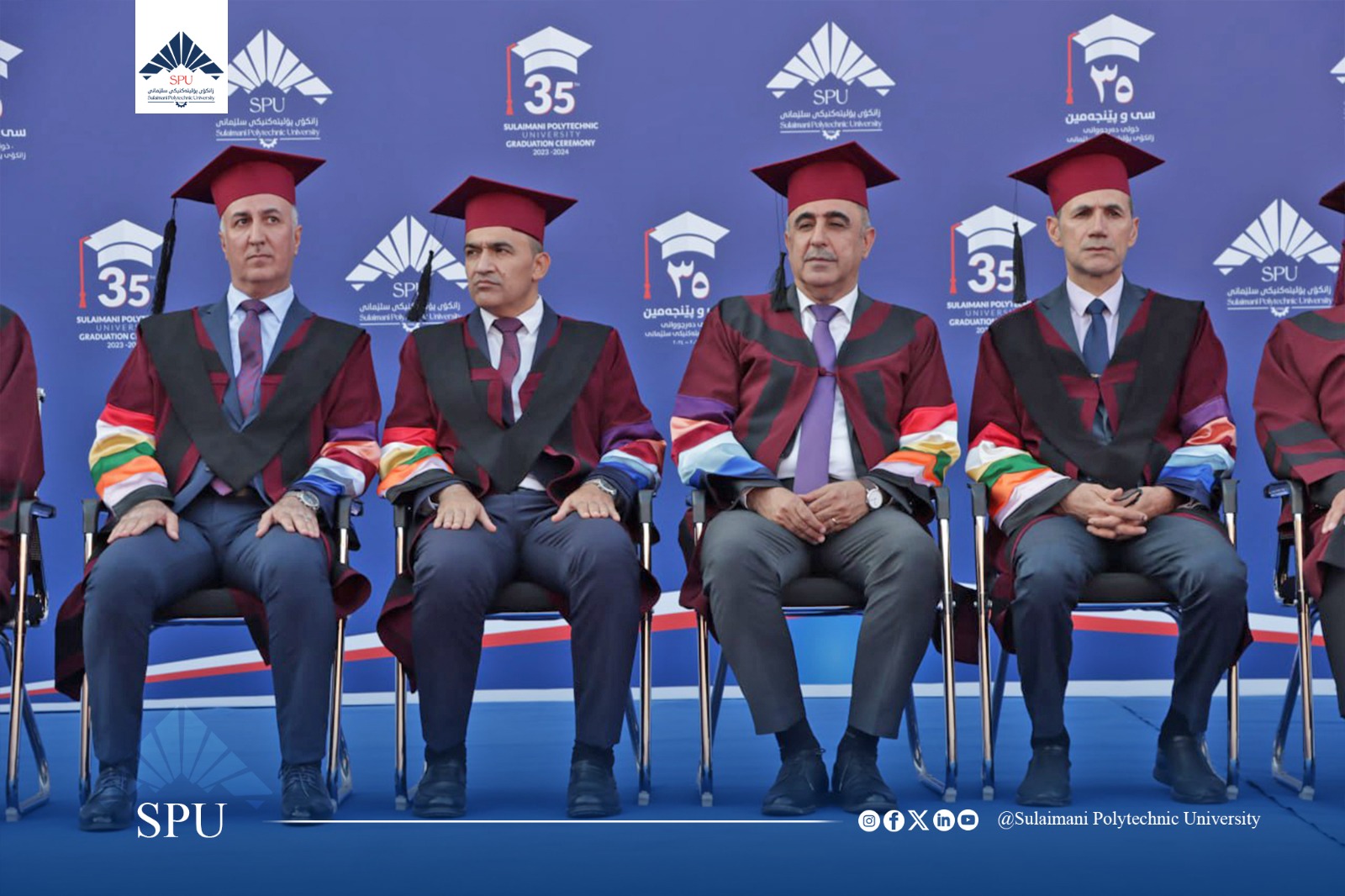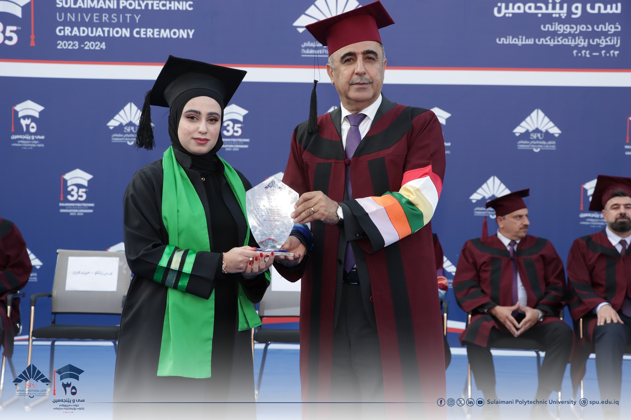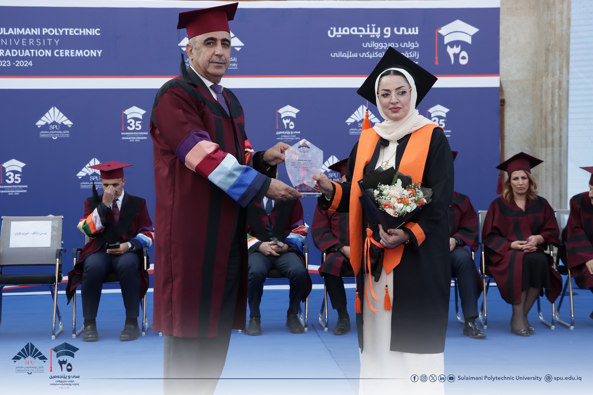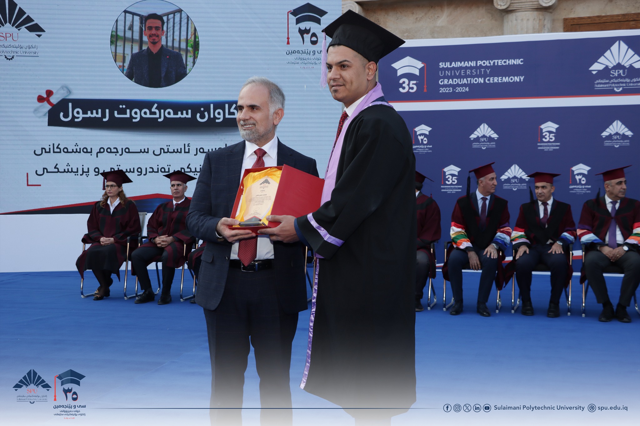 Prof. Dr. Hoshyar Abdullah Aziz, President of Sulaimani Polytechnic University, delivered a speech. After welcoming the guests, he congratulated all the students and wished them a bright future. In his speech, he hoped that in the future they will play a significant role in the development of Kurdistan. He reaffirmed the support of the university to the students and said that the level of science is very advanced. He also said that as one of the most prominent scientific and technological centers in the Kurdistan Region, Sulaimani Polytechnic University has always tried to become a bridge between science and industry, between theory and practice, so you, as graduates of this university, are now part of this proud heritage.