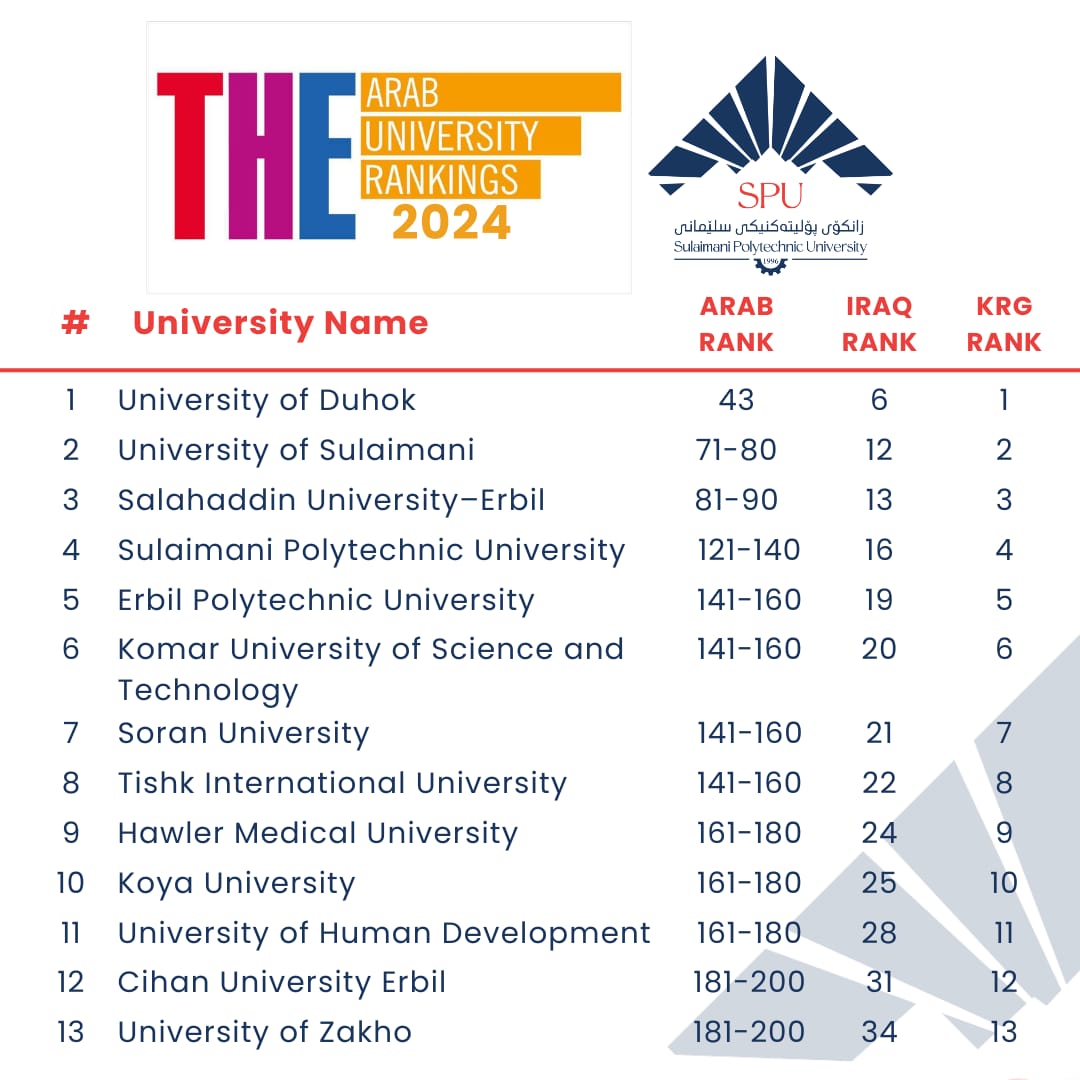 Among the progress achieved by Sulaimani Polytechnic University in the past two years, it has been ranked for the first time in 2024 by Times Higher Education.