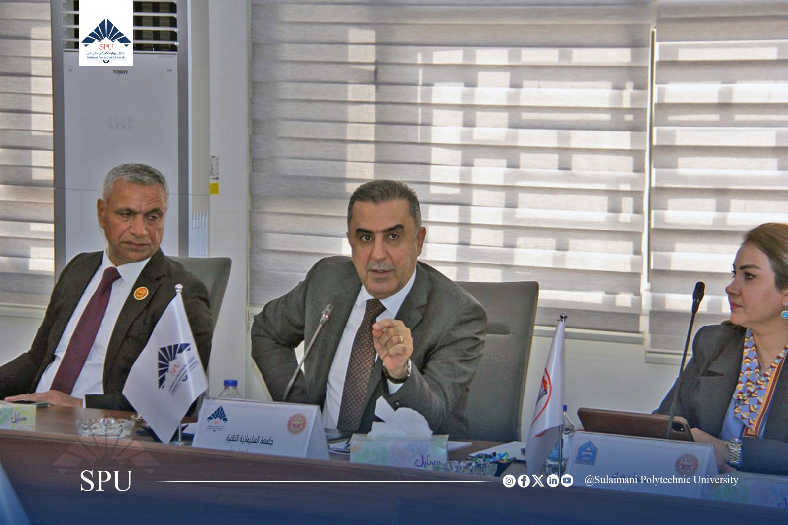 The meeting addressed several important topics, including greater coordination between the universities of the Iraqi government and the Kurdistan Regional Government. During the meeting, the President of Sulaimani Polytechnic University delivered a speech on behalf of the participating polytechnic universities in the Kurdistan Region, highlighting the role of these universities in continually striving to organize their education programs and align them with the labor market, ensuring that their graduates can become self-employed.